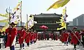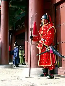 The guards wore royal uniforms, carried traditional weapons, and played traditional instruments.[1] The Sumunjang and Sujongjang wore and plate and mail armor (gyeongbeongap, Hangul: 경번갑, hanja: 鏡幡甲) and the Gapsa wore dudumiggap (Hangul: 두두미갑, hanja: 頭頭味甲), a ceremonial armor that does not provide protection in battle.[2]