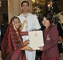 ![]() The President Pratibha Devisingh Patil presenting the Arjuna Award for the year-2011 to Wangkhem Sandhyarani Devi for Wushu. | ||||||||||||||||||||||||||