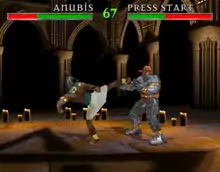 Released by Midway as the first of its new 3D software prior to the release of Mortal Kombat 4, War Gods was developed by a team led by Joe Linhoff and George Petro.[9] The arcade game utilized a hybrid of the hardware used for Cruis'n USA with a hard drive for data storage.[10][11] All the moves were recorded using motion capture with just two actors.[12] The in-game characters were created using a technology called "digital skin", which involved digitizing reference photographs of live actors and mapping them onto 3-D models.[1]