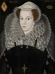 A narrative of Mary's execution on 8 February 1587 by "R. W.", Robert Wingfield,[89] mentions her costume as she left her bedchamber; "her borrowed hair" a wig, and on her head she had a dressing of lawn edged with bone lace, a pomander chain and an "Agnus Dei" about her neck, a Crucifix in her hand, a pair of beads (a rosary) at her girdle, with a golden cross at the end of them. She had a veil of lawn fastened to her caul bowed out with wire, and edged round about with bone lace. Her gown was of black satin painted, with a train and long sleeves to the ground, with acorn-shaped buttons of jet and pearl. She had short or half sleeves of black satin, over a pair of sleeves of purple velvet. Her kirtle was of figured black satin, her petticoat upperbody unlaced in the back of crimson satin,[90] and her petticoat skirt of crimson velvet, her shoes of Spanish leather with the rough side outward, a pair of green silk garters, her nether stockings of worsted were coloured watchet (sky blue), clocked with silver, and edged on the tops with silver, and next by her leg, a pair of white Jersey hose.[91][92][93]