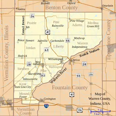There are four incorporated towns in the county. The largest is Williamsport, which is on the western banks of the Wabash River in the eastern part of the county, just downstream of Attica (which is on the east side of the river in Fountain County); in 2010, its population was 1,898—nearly one-fourth of the county's total.[56] West Lebanon is about 5 miles (8.0 km) west of Williamsport on State Road 28, with a population of 723.[57] The town of Pine Village lies about 11 miles (18 km) to the north of Williamsport where State Road 55 intersects State Road 26, near the northern edge of the county; 217 people live in Pine Village.[58] State Line City is in the southwestern part of the county and shares its western border with the Illinois state line. A small Illinois community named Illiana lies immediately on the west side of the county road which runs along the state border (and which is also a street between the two communities). State Line City is the smallest of the towns, with a population of 143.[59]