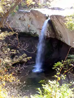The highest free-falling waterfall in the state, Williamsport Falls, is located in downtown Williamsport; a stream named Fall Creek flows through the town and falls 90 feet (27 m) over a sandstone ledge less than 1,000 feet (300 m) from the county courthouse.[42] Northeast of Independence is the Black Rock Barrens Nature Preserve, a rare siltstone glade area that, with the adjacent Weiler-Leopold Nature Reserve, supports a diversity of flora including sessile trillium, phlox and wild hyacinth in the moist lowlands and serviceberry, rue anemone, birdsfoot violet and yellow pimpernel on the drier slopes.[43][44][45] Big Pine Creek is the county's largest waterway after the Wabash River, and 10.5-mile (16.9 km) segment of it is designated by the Indiana Department of Natural Resources as a state natural and scenic river and passes near Fall Creek Gorge Nature Preserve, an area of cascades and potholes.[46]