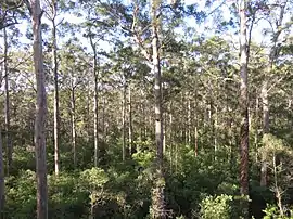 The park is dominated by old growth karri trees, some of which are almost 90 m (300 ft) in height.[2] Some of these trees were used to act as fire lookout towers built during the 1930s and 1940s. The 75 m (246 ft) Dave Evans Bicentennial Tree is situated within the park and was pegged in 1988 as part of Australia's bicentennial celebrations. This is one of three trees found around Pemberton that tourists are able to climb.[3]