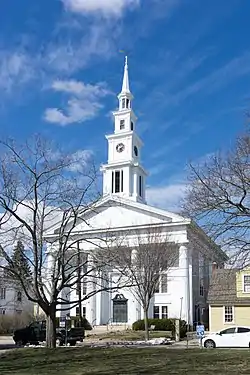 The Warren United Methodist Church and Parsonage are a Methodist church and house at 27 Church Street in the center of Warren, Rhode Island. The church was started in 1789 under the Rev. Daniel Smith and was the first Methodist congregation in Rhode Island. The building is a Greek Revival structure with a full temple front built in 1844 by Fall River, Massachusetts architect Perez Mason.[2] The parsonage is a two-story Italianate structure built by the congregation in 1858. It was designed by the Warren firm of Hoar & Drown and built by the related firm of Hoar & Martin.[3]