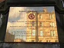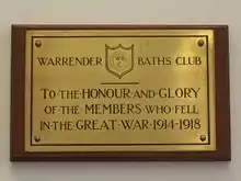 In 1906 Warrender Baths closed for economic reasons but the Club carried on at Portobello swimming pool. In 1908, Edinburgh Corporation purchased the site and opened the baths to the public. Warrender Baths Club returned to its original location[3] and in 1910 a ladies section was formed.[6] The club wound down activities during World War I as all senior club members joined the forces. A plaque in the front lobby of Warrender Baths commemorates those who died in this war - one, David McGregor, was awarded Britain's highest award for valour, the Victoria Cross.[6][7]