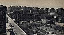 During this fight on 22 April, SS officer Hans Dehmke was killed when gunfire detonated a hand grenade he was holding.[24] When Stroop's ultimatum to surrender was rejected by the defenders, his forces resorted to systematically burning houses block by block using flamethrowers and fire bottles, and blowing up basements and sewers. "We were beaten by the flames, not the Germans," survivor Marek Edelman said in 2007; he was deputy commander of the ŻOB and escaped the ghetto in its last days.[25] In 2003, he recalled: "The sea of flames flooded houses and courtyards. ... There was no air, only black, choking smoke and heavy burning heat radiating from the red-hot walls, from the glowing stone stairs."[26] The "bunker wars" lasted an entire month, during which German progress was slowed.[27]