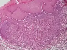 Warty dyskeratoma, also known as an Isolated dyskeratosis follicularis,[1]: 777 is a benign[2] epidermal proliferation with distinctive histologic findings that may mimic invasive squamous cell carcinoma[3] and commonly manifests as an umbilicated (Having a central mark or depression resembling a navel) lesion with a keratotic plug,[4] WD have some histopathologic similarities to viral warts but it's not caused by HPV and the majority of these lesions display overall histopathologic features consistent with a follicular adnexal neoplasm.[5] Usually limited to the head, neck,[6] scalp[7] or face and vulva.[6] Lesions are generally solitary and sporadic and may be associated with a follicular unit. Oral involvement,[4] particularly the hard palate, and genital involvement have been reported. it can also be thought of as one of the manifestations of focal acantholytic dyskeratosis, an epidermal reaction pattern that can be seen in several disorders, including Darier's disease and Grover's disease.[8]: 639 But the main Difference between Darier disease and Warty dyskeratoma, is that Darier disease inherited dermatosis (autosomal dominant) consisting of multiple keratotic papules on the face, trunk, and extremities, while WD occurs as an isolated, noninherited, single keratotic nodule mainly confined to the head and neck as mentioned earlier.[6]