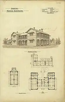 In 1878 the Queensland Government raised a loan of £5,000 to build a new hospital in Warwick. However, it was not until September 1880 after considerable local agitation that the government called for tenders to build the hospital, resulting in a contract awarded to A.W. Doorey to build the hospital.[17][18][19] However, by February 1881, tenders were being called for again, and in April 1881 the Queensland Government announced the hospital would not proceed.[20][21] In June 1881, the government indicated that they would proceed if the local financial subscriptions to the hospital were increased.[22] Tenders were called again in February 1882 resulting in a contract with Messrs Wallace and Gibson in March 1882.[23][24] Finally on Thursday 19 June 1884, the patients were moved from the old hospital to the new hospital in Locke Street.[25]