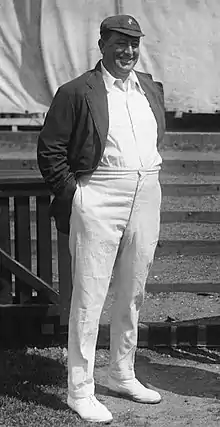 Armstrong was selected as part of the Australian cricket team to tour England in 1902.[19] He started the tour well, taking eight for 47 in the second innings against Nottinghamshire, his best bowling figures to that date.[20] The first Test, at Edgbaston was rain-affected and the Australians were lucky to come away with a draw, being dismissed for 36 in their first innings.[21] The rest of the close-fought series was followed with interest by the English public. The second Test at Lord's was rained off, and Australia won the third at Bramall Lane by 143 runs. The final two Tests were nail-biters—Australia winning the fourth at Old Trafford by only three runs and England earning a consolation victory in the fifth Test at the Oval by one wicket, when last-wicket pair George Hirst and Wilfred Rhodes eked out the final runs.[22] Armstrong had a good tour, making 1,075 runs at 27.56 and taking 72 wickets at an average of 17.90, but the star for the Australians was Victor Trumper, who made 2,570 runs at an average of 48.49 including eleven centuries.[22]
