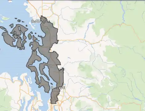 Washington's 2nd congressional district includes all of Island and San Juan counties, and neighboring areas on the mainland, from Bellingham in the north to Lynnwood in the south. Before re-districting in 2012, the district encompassed the northern portion of Western Washington, from the vicinity of the King/Snohomish county line to the Canada–US border, including the San Juan Islands and the exclave of Point Roberts. Since 2001, it has been represented by Democrat Rick Larsen.