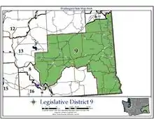 Washington's 9th legislative district is one of forty-nine districts in Washington state for representation in the state legislature. The sprawling rural district includes all of Adams, Asotin, Franklin, Garfield, and Whitman counties as well as parts of Spokane County. The district resides in the extreme southeast of the state, bordering Oregon to the south and Idaho to the east.[1]