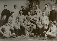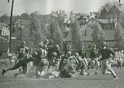At the same time its activities was becoming more scrutinized, the football team became more successful. The season finale in 1896 at Exposition Park in Pittsburgh was one of the largest crowds in western Pennsylvania history, when an overflow crowd of 12,000 watched W&J defeat Duquesne Country and Athletic Club 4–0.[11] But was the September 29, 1897, game against the University of Pennsylvania Quakers that marked the "birth of big-time football" at W&J.[11] The Red and Black lost 18–4 to the eventual national champions, but W&J counted it a moral victory, since they were missing 4 of their 11 starters due to new eligibility requirements.[11] In a game against Denison University on Sept. 19, 1908, W&J became the first college football team in history to wear numbered uniforms.[12][13]