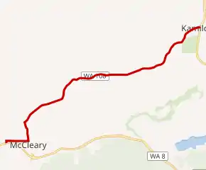 SR 108 begins at an intersection with SR 8, an east–west expressway across the Olympic Peninsula, west of McCleary in Grays Harbor County.[4] The highway briefly travels north before turning east onto West Simpson Avenue towards the city. SR 108 passes through downtown McCleary before turning north onto Summit Road at South 3rd Street, where its business route splits to head south. The highway travels around the Simpson Door Company factory and leaves the city before turning off Summit Road to follow the Puget Sound and Pacific Railroad.[5][6]