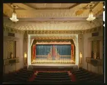 The theater is located at 305 Main Street, within the Anaconda Commercial Historic District. It was the last theater constructed in the United States in the Nuevo Deco (a form of Art Deco) style. The theater was designed in 1930 by Seattle architect B. Marcus Priteca. It was almost entirely finished by 1931, but its opening was delayed until Thursday, September 24,[2] 1936 because of the Great Depression. In 1936 dollars, its construction cost was a grand $200,000 (equivalent to $3,906,000 in 2021). The Smithsonian rates the Washoe as a national treasure due to the lavish interior. April 30, 1982, the Washoe was listed on the United States National Register of Historic Places for architectural significance.