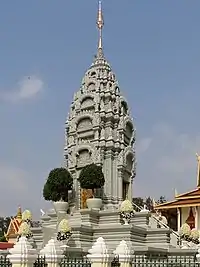 - Chedei (Khmer: ចេតិយ) or Chedi (Thai: เจดีย์; Lao: ເຈດີ) from Sanskrit: chaitya, temple or that (Lao: ທາດ): It is also known as a stupa. Usually conical or bell-shaped buildings, but many Cambodian stupas are constructed in the style of temple shrine. They often contain relics of Buddha. The urns containing the ashes of the cremated dead are kept here and serve as memorials for those ancestors.