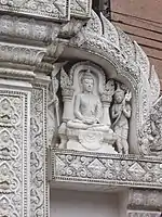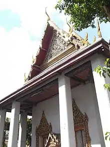 Highlights of this temple include the replica of Dhamek Stupa in Lanka architectural style. In Thailand there are only two stupas of this kind, besides here is Wat Sommanat Wihan in Nang Loeng area. The temple gate stucco sculpted of floral and deities patterns.[3]