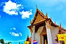 The outstanding construction is the ubosot (ordination hall)'s gable is featuring Lord Vishnu mounted on garuda, on top of the demon Rāhu placed between two nāgas and flanked by 26 devas.
