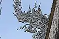 Ubosot: The principal building, the ubosot is an all-white building with fragments of mirrored glass embedded in the building's exterior. The ubosot embodies design elements from classic Thai architecture such as the three-tiered roof and abundant use of Naga serpents.[3] "Inside the temple, the decor swiftly moves from pristine white to fiery and bewildering. Murals depict swirling orange flames and demon faces, interspersed with Western idols such as Michael Jackson, Neo from The Matrix, Freddy Krueger, and a T-800 series Terminator. Images of nuclear warfare, terrorist attacks such as the World Trade Center attack, and oil pumps hammer home the destructive impact that humans have had on earth. The presence of Harry Potter, Superman, and Hello Kitty confuses the message somewhat, but the overall moral is clear: people are wicked."[6]