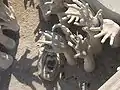 The bridge of "the cycle of rebirth": the main building at the white temple, the ubosot, is reached by crossing a bridge over a small lake. In front of the bridge are hundreds of outreaching hands that symbolize unrestrained desire. The bridge proclaims that the way to happiness is by foregoing temptation, greed, and desire. Next to the lake stand two very elegant Kinnaree, half-human, half-bird creatures from Buddhist mythology.[3]