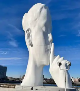 Water's Soul is a sculpture along the Hudson River Waterfront Walkway in the Newport section of Jersey City. It depicts a woman with closed eyes holding a finger to her lips in a state of silent contemplation and self-reflection. The work was conceived by Jaume Plensa and commissioned by LeFrak and Simon Property Group. Made of polyester resin, fiberglass, and marble dust, the work is white and stands 80 feet (24 m) tall. It faces the Hudson River and the New York City skyline.[1][2][3][4][5] It was created at Plensa's Barcelona studio and shipped in 23 containers, each 40 feet (12 m) feet long, to the site.[6]