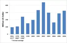 Investment Since the sector was prepared for self-sufficiency, investment increased significantly from an annual average of about US$ 100m in the period 1965 to 1989 to an annual average of US$ 242m in the period 1990 to 1998, when the first company was privatized.[24] According to SISS, since 1998 the annual investment ranges between US$ 151m (1999) and US$ 443m (2002).[25] Total investment in 2006 was US$ 325m.[2]