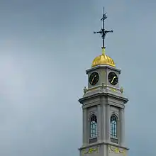 The tower's lowest stage has corner pilasters and louvered flat-topped openings in all four sides. Above it is a blind balustrade with corner posts and swags. Pilasters frame arched openings. Another blind balustrade, its corners topped with urns, has clocks in all four faces. The final stage is a bell-cast gilded roof with bronze weathervane.[1]: 3