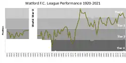From 1921–22, the third tier of The Football League consisted of two parallel sections of 22 clubs, fighting both for promotion to the Second Division and also battling to hold on to their league status.[4] There was a re-election system in place which meant the bottom two teams in each of the two divisions had to apply for re-election to the league.[10] Watford finished outside the top six league positions in every season between 1922 and 1934. Following Kent's departure in 1926, they finished 21st out of 22 clubs in 1926–27, but were unanimously re-elected to the league after a ballot of clubs in the top two divisions of The Football League.[11] By contrast, under Neil McBain and subsequently Bill Findlay, the team recorded five consecutive top six finishes between 1934–35 and 1938–39, and won the Football League Third Division South Cup in 1937.[12] The Football League was suspended in 1939 due to the Second World War.
