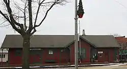 In 1896 (or 1892?[4]) the original depot burned and the C&NW built the current depot in 1896. It is a one-story wooden building clad in drop-siding, with wide overhanging eaves supported by brackets, with carved bargeboards in some of the gable peaks.[3]