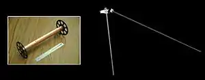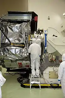 Waves is an experiment on the Juno spacecraft to study radio and plasma waves.[1][2] It is part of collection of various types of instruments and experiments on the spacecraft; Waves is oriented towards understanding fields and particles in Jupiter's magnetosphere.[2] Waves is on board the unmanned Juno spacecraft, which was launched in 2011 and arrived at Jupiter in the summer of 2016.[1] The major focus of study for Waves is Jupiter's magnetosphere, which if could be seen from Earth would be about twice the size of a full moon.[3] It has a tear drop shape, and that tail extends away from the Sun by at least 5 AU (Earth-Sun distances).[3] The Waves instrument is designed to help understand the interaction between Jupiter's atmosphere, its magnetic field, its magnetosphere, and to understand Jupiter's auroras.[4] It is designed to detect radio frequencies from 50 Hz up to 40,000,000 Hz (40 MHz),[5] and magnetic fields from 50 Hz to 20,000 Hz (20 kHz).[6] It has two main sensors a dipole antenna and a magnetic search coil.[6] The dipole antenna has two whip antenna's that extend 2.8 meters (110 inches/ 9.1 feet) and they are attached to the main body of the spacecraft.[6][7] This sensor has been compared to a rabbit ears set-top TV antenna.[8] The search coil is overall a mu metal rod 15 cm (6 in) length with a fine copper wire wound 10,000 times around it.[6] There are also two frequency receivers that each cover certain bands.[6] Data handling is done by two radiation hardened systems on a chip.[6] The data handling units are located inside the Juno Radiation Vault.[9] Waves was allocated 410 Mbits of data per science orbit.[9]