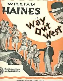 Way Out West is a 1930 American pre-Code comedy, action, drama, music, romance, western parody directed by Fred Niblo and starring William Haines, Leila Hyams, Polly Moran, and Ralph Bushman. It tells the story of Windy, a con man who cheats a group of cowboys out of their money. When they discover his cheating and learn that he has been robbed, they force him to work on a ranch until he has paid his debt.