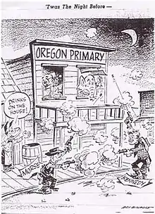 The Kennedy campaign began to focus on Oregon. Its workers repeatedly denied that Morse was a serious candidate, but to make sure of a win, the campaign sent Rose Kennedy and Ted Kennedy to speak in Oregon and outspent Morse $54,000 to $9,000.[69] Morse often found himself responding to Kennedy's claim that he was not a "serious candidate", by proclaiming: "I'm a dead serious candidate."[70] Quietly, Oregon Democrats began to worry about what a loss for Morse would mean in 1962 against possible Republican challenger Governor Mark Hatfield. Morse would use this to his advantage to help sway undecided Democrats, claiming that if he lost in the primary, it would certainly help Republicans defeat him in 1962. Kennedy brushed off this argument by claiming that regardless of the outcome of the presidential primary, the people of Oregon had a tremendous respect for Wayne Morse and would send him back to the Senate, and that he would even come back to Oregon in 1962 to campaign for him.[71] On Election Day, Morse came up roughly 50,000 votes short of defeating Kennedy. Morse abandoned his presidential race that same week.[72]