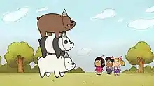 The Bears often form a "bear stack", which they use to get around the city, and has become perhaps the most recognizable image from the show.[6] Occasionally, the bears share adventures with their friends, such as child prodigy Chloe Park, bigfoot Charlie, the bears' rival and internet sensation koala Nom Nom, park ranger Tabes, and produce saleswoman Lucy. Some flashback episodes chronicle the adventures of the bears as cubs trying to find a home.