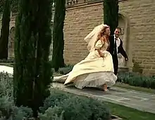 The wedding dress was a Vera Wang original dress from a while ago that I actually wore on a certain occasion and had it in storage and when we came up with the concept for the video that had the element of a wedding in it, I said, ‘well, I do have my old wedding dress,’. 'It’s still worth [sic] for me ’cause I can’t believe I was ever married but whatever, end of story. And I knew that we wouldn’t be able to get a fabulous dress like in two days so I just took that dress out of the storage – it has a 27-foot train and it was just all hand-beaded and stuff and so I figured we might as well get a use out of it.'[73]