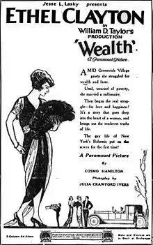 Wealth is a 1921 American silent drama film directed by William Desmond Taylor, written by Cosmo Hamilton and Julia Crawford Ivers, and starring Ethel Clayton, Herbert Rawlinson, J.M. Dumont, Larry Steers, George Periolat, and Claire McDowell. It was released on August 21, 1921, by Paramount Pictures.[1][2] It is not known whether the film currently survives,[3] and it may be a lost film.[4]