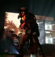 Skinny Puppy began performing the album's songs from January 2014 onward, starting with the Live Shapes for Arms tour. The set lists covered a broad range of material, and the stage show was elaborate and complicated.[28][29] Later in 2014, the band returned to the road for another tour entitled Eye vs Spy, bringing Youth Code, Haujobb, and Front Line Assembly as opening acts.[30][31] These performances saw Ogre changing between numerous costumes throughout the show, playing a character undergoing stages of mutation at the hand of nuclear radiation.[32][30] Ogre began these shows as a hunch-backed, rain-coated figure with a white mask, an umbrella with a fallout symbol, a cumbersome box, and a plaster dog statue.[30] As the show progressed, he became a force-fed animal with a suit of many pelts, and later a deformed monstrosity affected by the radiation let loose from the box.[33] The themes of experimentation had previously been explored on Skinny Puppy's 1988 tour in support of the album VIVIsectVI,[34] as had the concept of bodily mutation on the 1992 Last Rights tour.[35]