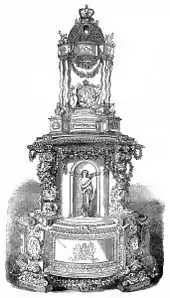 Traditionally the bride would place a ring inside the couple's portion of the cake to symbolise acceptance of the proposal.[9] Bride's pie would evolve into the bride's cake. At this point the dessert was no longer in the form of a pie and was sweeter than its predecessor.[10] The bride cake was traditionally a plum or fruit cake. In the mid-18th century, double icing, which means covering the cake first with almond icing and then with white icing, was used in bride cake.[11] The white-iced upper surface of the bride cake was used as a platform on which all sorts of scenes and emblems could be mounted. The decoration was often at least partially three-dimensional and colourful in appearance. However, since some decorations were made with a variety of substances, sometimes the decoration or even parts of wedding cake were inedible.[11] The myth that eating the pie would bring good luck was still common but the glass ring slowly died out and the flower bouquet toss replaced it.
