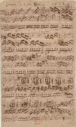The autograph manuscript is remarkable for its detailed specifications of organ registration and use of the two manuals. As explained in Williams (2003), their main purpose was to enable the concerto to be heard at Bach's desired pitch. The markings are also significant for what they show about performance practise at that time: during the course of a single piece, hands could switch manuals and organ stops could be changed.[22][23][24]