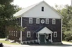 Weld Town Hall is located on the south side of School Street, just east of Houghton Brook and a short way east of the junction of School Street with Mill Street (Maine State Route 142). It is a large two-story rectangular wood-frame structure, with a front-gable roof, shingle and clapboard siding, and a cement foundation. The first floor of the main (north-facing) facade is five bays wide, with a center entrance and two sash windows on either side. The center three bays are sheltered by a gable-roofed portico, supported by square posts, with a handicap access ramp leading down to the left. The second floor facade has four windows spaced symmetrically but at irregular intervals, with a Masonic shield at the center. The gable end has a single sash window.[2]