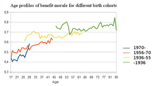 There is also a clear correlation between increased social spending and deteriorating benefit morale, a phenomenon predicted by economist Assar Lindbeck. The size of the welfare state does not correlate with low benefit morale, since a high benefit morale is a precondition for viable welfare states; it is the growth of the welfare state that predicts deteriorating benefit morale. The Swedish example illustrates this with declining benefit morale accompanying the development of a generous welfare state, and a break in the trend following the roll-back of the state since the 1990s. Detrimental effects of the welfare state are consistent with the large cohort differences in benefit morale.[60]