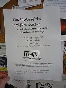 In the 1960s, black and female led movements for adequate welfare benefits and a resistance against negative stereotypes started to be seen throughout the United States in local and community contexts.[32] By organizing political demonstrations, creating welfare resource guides, advocating against restrictive welfare requirements (such as a disqualification for welfare benefits if there was an adult male figure in the household), and challenging the idea of a heteronormative, two-parent family structure being the gold standard for a functional and self-reliant household, these women (who referred to themselves as mothers to highlight the value of their labor at home) aimed to provide greater autonomy and reduce stigmatization for mother welfare-recipients.[32] They also argued against the control of female reproduction through welfare, that all women should have the choice whether or not to use birth control and that welfare support should not be contingent on how "deserving" the mothers were based on their choices.[32]