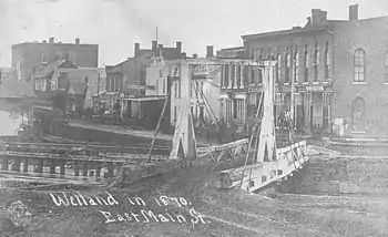 The Chippawa Road (as Main Street was then known) crossed the First Welland Canal (constructed between 1824 and 1829[1]) via a wooden swing bridge with the pivot set to one side of the canal. This was turned manually by pushing on heavy wooden beams extending from the end of the bridge.[2]