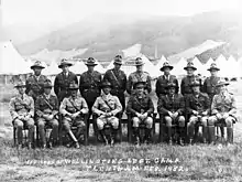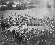 With the out break of the First World War in August 1914, the British Government requested for New Zealand to sent a military force to capture the German colony of Samoa. The Samoa Expeditionary Force was dispatched on 15 August and consisted of around 1400 soldiers and nurses.[12] The 5th (Wellington) Regiment provided two infantry companies, for a total of 559 men, which was the largest contribution of any unit in the New Zealand Military Forces. 26 men from the regimental band also travelled with the expeditionary force. Samoa was occupied without incident and the occupation force was relieved in April 1915 by a smaller force of 360 personnel who were unfit for active service.[13]