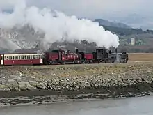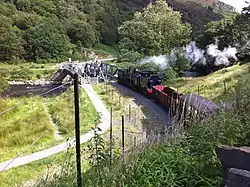 Two further LROs enabled improvements to the railway's alignment at Beddgelert, a new station site in Porthmadog and a link to the Festiniog Railway.[7] McAlpine & Sons were contracted to refurbish the existing lines and complete the link between Rhyd Ddu and Croesor Junction, thus creating a railway that ran from Dinas to join the Festiniog Railway at Porthmadog.[8] Like the modern day WHR, the railway was opened in stages. The former NWNGR section re-opened on 31 July 1922 and the remainder on 1 June 1923.[7]