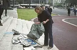 Cymdeithas yr Iaith believes in direct action, and in the course of its campaigns over a thousand people have appeared before the courts for their part in various campaigns, many receiving prison sentences, making it Britain's largest protest group since the suffragettes – in terms of fines and the numbers sent to prison.[6][7] Typical actions include painting slogans on buildings owned by businesses, and other minor criminal damage.[8][9][10] At the beginning of the 1970s Cymdeithas began to campaign for a Welsh-language radio and television service. Radio Cymru was established in 1977, but in 1979 the Conservative government under Margaret Thatcher announced that it would not keep its election promise to establish a separate Welsh-language television channel. Some protesters refused to buy television licences and others climbed up television masts and invaded television studios.[11] The government reversed its position and a Welsh-language TV channel S4C was launched in 1982.