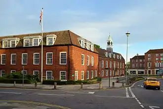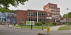 New offices were built on the site of the former parish council's offices at the corner of Bridge Road and The Campus. The new building was formally opened in January 1937.[22][23] This building served as the headquarters of Welwyn Garden City Urban District Council until its abolition in 1974. Between 20 May 1948 and 31 March 1966 the development of the town was also administered by the Welwyn Garden City Development Corporation, set up under the New Towns Act 1946.[24]