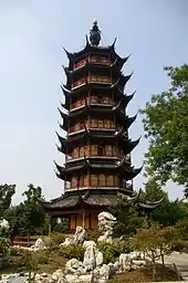 Wenbi Tower (Chinese: 文笔塔) is a tower in Changzhou, China, located near Hongmei Park. It was built during the Southern Dynasties, Qi Gaozu, Xiao Daocheng (萧道成), Jianyuan (479-482), and first named Jianyuan Temple.[1] Later, it was changed to Peace Tower. Because the tower looks like a pen, people changed the name into Wenbi Tower. As time went on, the temple had been deteriorated because of wars, natural disasters and the Cultural Revolution. Not until the Chinese economic reform did Liu Biru, a Chinese-American, subsidized restoration of the temple in 1982.