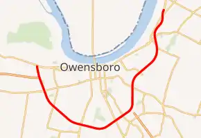 The expressway eventually received the designation of U.S. Route 60 Bypass (US 60 Byp.). In 2004, US 231 was rerouted onto the expressway and onto US 60 east of town so that it would be rerouted to the completed William H. Natcher Bridge once it was completed during that year.[5] US 231 was previously carried over the Ohio River on the Owensboro Bridge.[6]