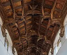 The only church dedicated to Wendreda is at March and is notable for its double-hammer beam roof celebrating the saint with 118 angels, carved from oak, the largest of them half life-size, looking down into the church with wings outstretched.[6] John Betjeman said of it that it was "worth cycling forty miles in a head wind to see",[7] and Clive Fewins has called it "the finest of all angel roofs".[8]