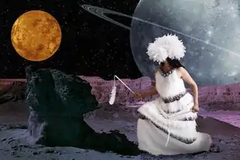 The Spokesman-Review noted, "Red Star works in a variety of media. Her fiber work blends traditional and contemporary elements, as in her pieces Rez Car Shawl and Basketball Shawl. Her photographs combine stereotypical and authentic images, references to the past and modern day. Many are self-portraits."[11] Red Star's work often includes clichéd representations of Native Americans, colonialism, the environment, and her own family.[12] The Gorman Museum at UC Davis described her work as layering "influences from her tribal background (Crow), daily surroundings, aesthetic experiences, collected ephemera and conjured histories that are both real and imagined."[13] Though she often deals with serious issues of Native American culture, she often employs humor through the inclusion of inflatable animals, fake scenery, and other elements in the work.[14] In her photography, Red Star often depicts herself in traditional elk-tooth dresses that she creates.[15]