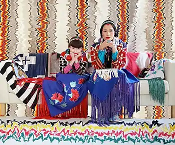 Most photographs of Crow women are colorless, so Wendy Red Star took photographs of herself and her daughter Beatrice with colorful Crow clothes to showcase Crow people's everyday fashion. The patterned background is photoshopped to give the images a visual punch.[25]